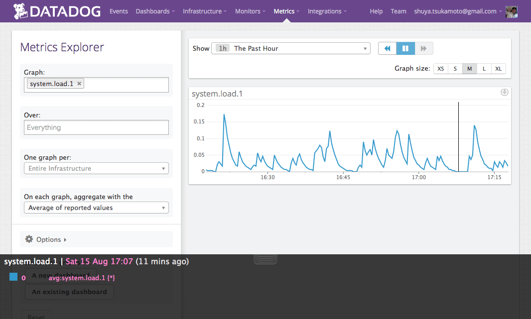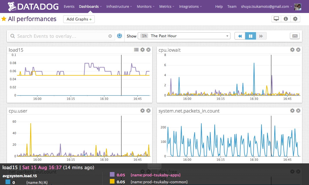 色々あるのですが、ずばり1点だけ紹介するとしたら何といってもメトリクスのグラフ表示機能です!自分もこのblogサーバやWebアプリサーバの監視にDatadogを利用していますで、ここはひとつ自分の例をお見せしましょう。
