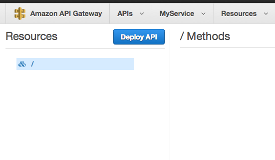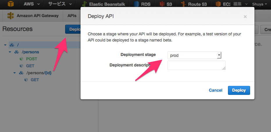 設定内容が即時反映される訳ではなくて、API Gatewayの設定はステージという単位で区切られています。なので、Deployを行って新たなステージを作成します。