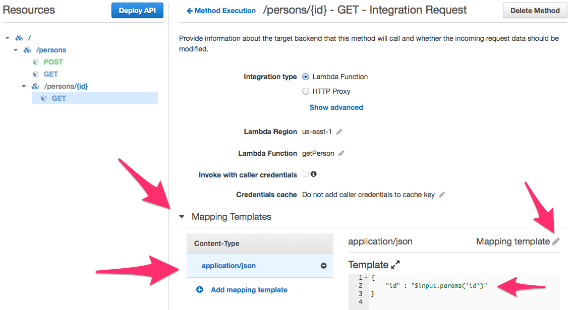 {id}だけ追加設定を行います。{id}をLambda function側に正しく渡してあげるために設定を行います。