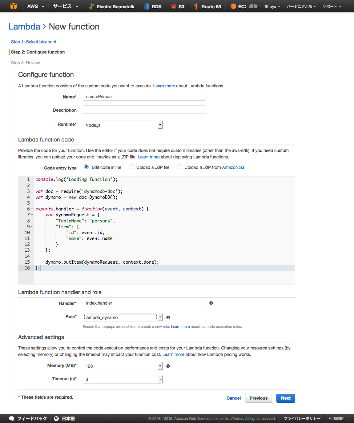 この通りやれば良いのですが、1点だけ注意点があって、API Gatewayは東京リージョンではまだ使えませんので、東京リージョンで作業するとAPI Gateway作成あたりでエラーが出ます。なのでバージニア北部などを選んでおきましょう。おそらくですが、Lambdaを東京で作った場合はLambdaの画面からではなく、API Gatewayの画面から連携設定すると上手く行くかと思います。