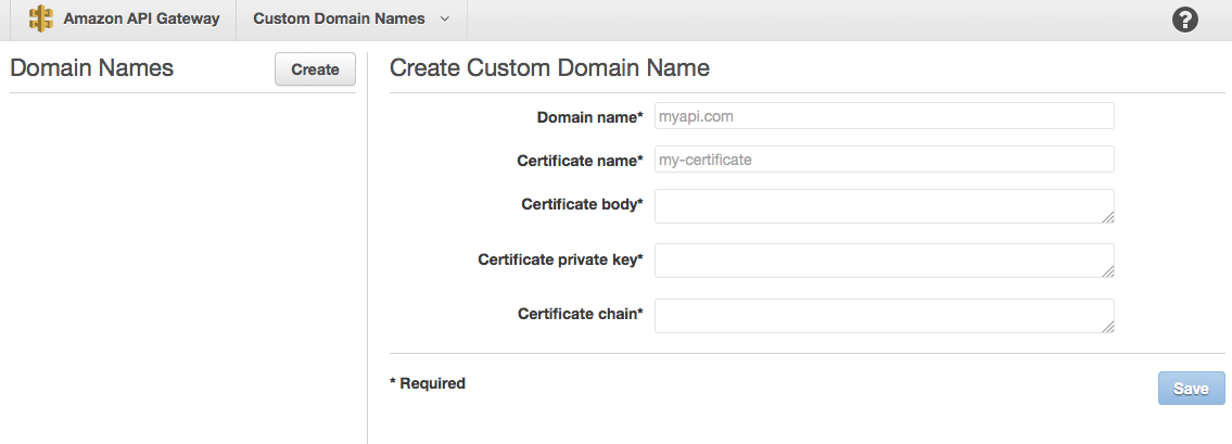 API Gatewayが発行したURLではなくて、自身が持つドメインを利用したい場合はこの画面を利用します。