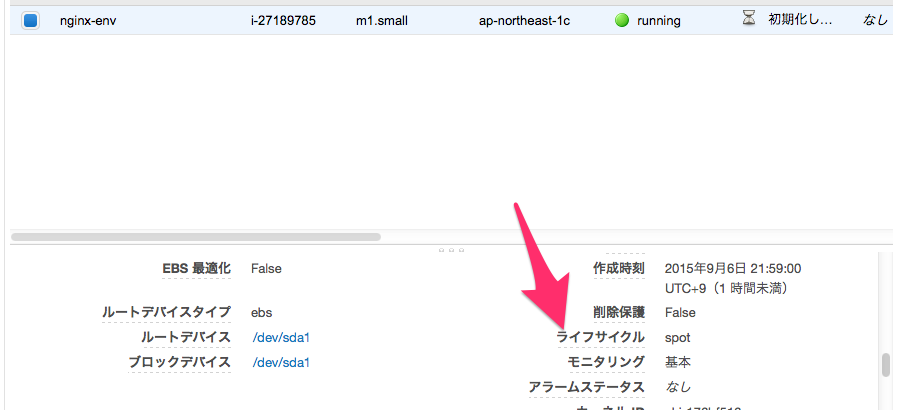 ライフサイクルがspotになっています。無事環境作成も終わり、nginxが見えるようになりました。