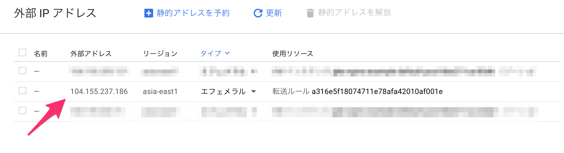 GCPのコンソール上でも確認できます。IPが作られてますね。