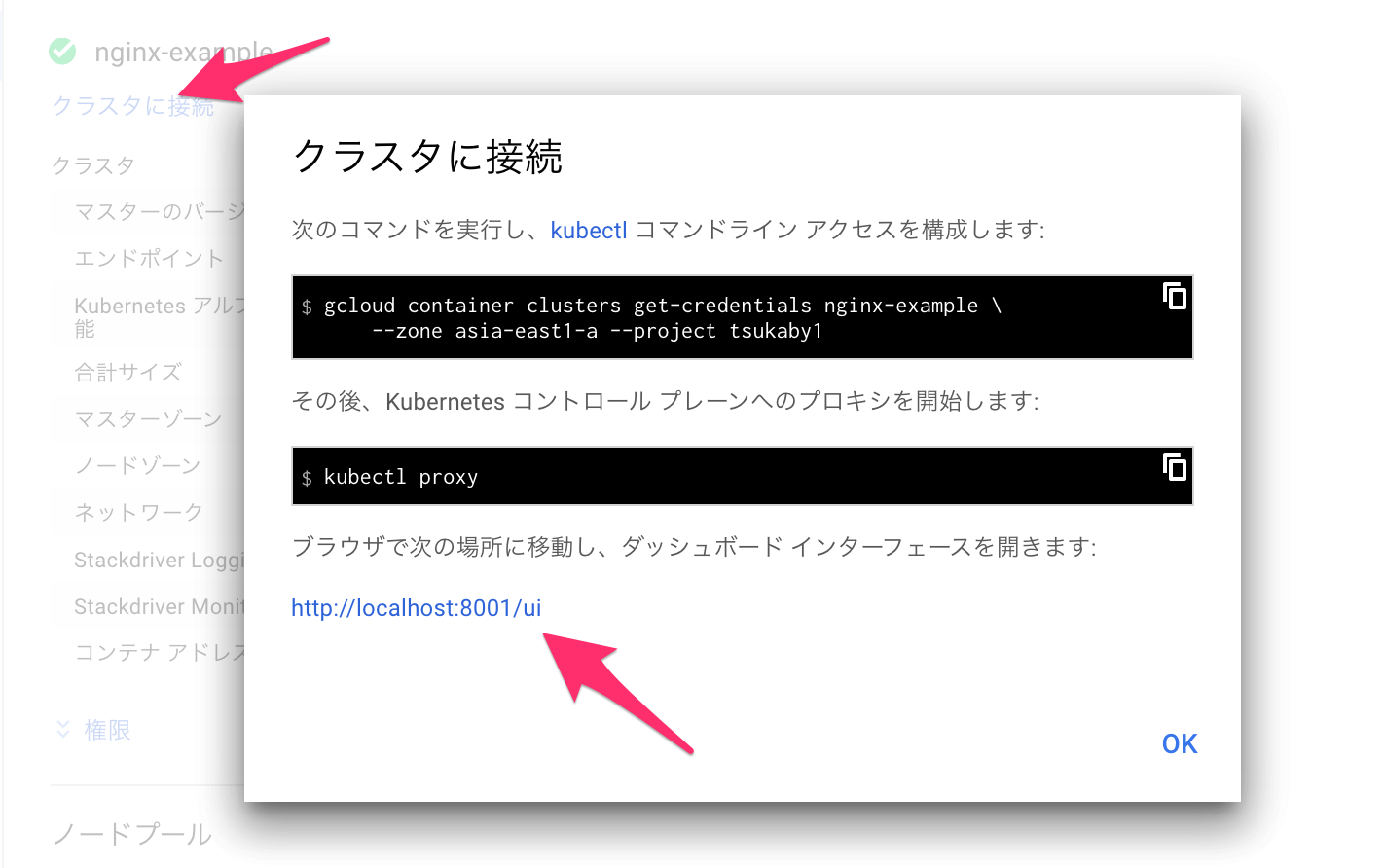 GKEのWebコンソール上でクラスタに接続と出るので、この指示通りに従います。自分の場合はproject名がtsukaby1となっているので、このあたりは各自自分の設定でやりましょう。