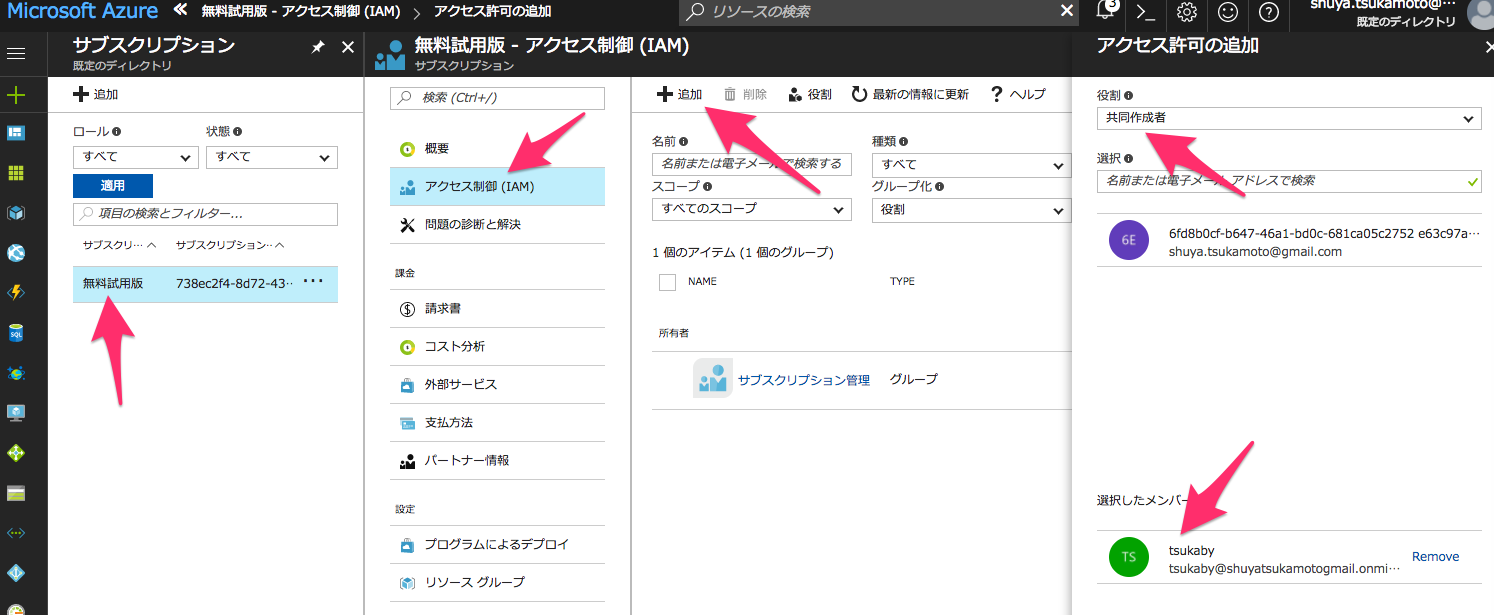 ポータル -> More services -> サブスクリプション -> 所有している「無料試用版」 -> アクセス制御(IAM) -> 追加