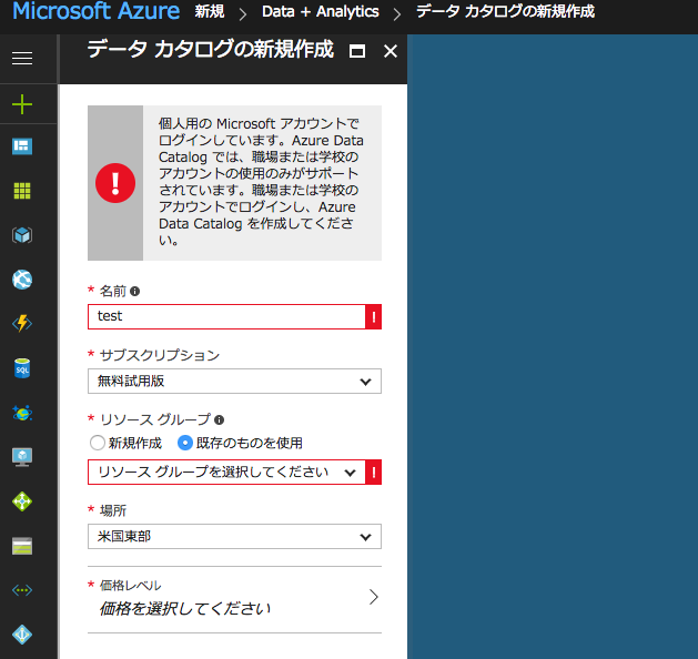 個人用の Microsoft アカウントでログインしています。Azure Data Catalog では、職場または学校のアカウントの使用のみがサポートされています。職場または学校のアカウントでログインし、Azure Data Catalog を作成してください。