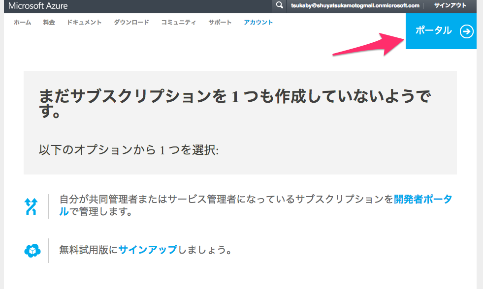 その後、Sing inすると以下のようなページが出ますが、すでに無料サブスクリプションは割り当ててあるので、無視してポータルへのリンクをクリックします。