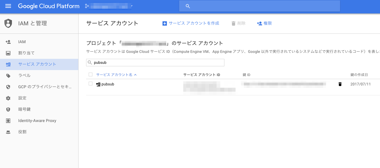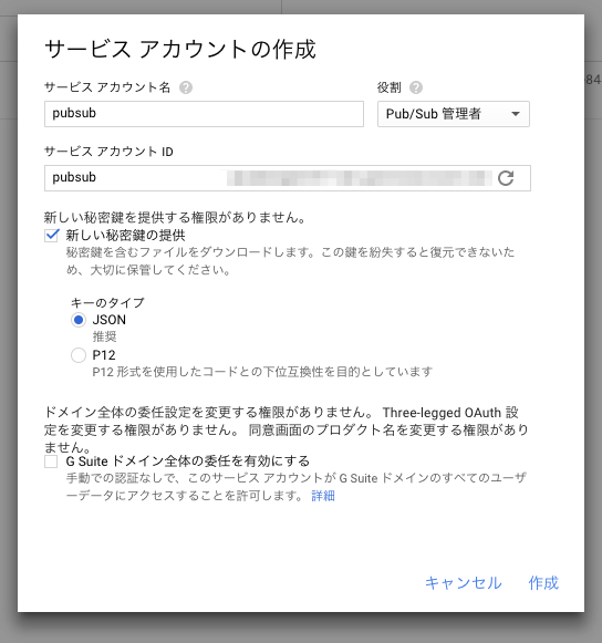 サービスアカウント名はpubsubとしましたが、本来はこのアカウントを利用するアプリケーション名が良いと思います。(アプリごとに権限を分けるはずなので)
