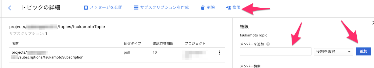 このときのメンバーはServiceAccountA(foo@myproject.iam.gserviceaccount.comみたいな文字列)、役割はPub/Sub サブスクライバーです。