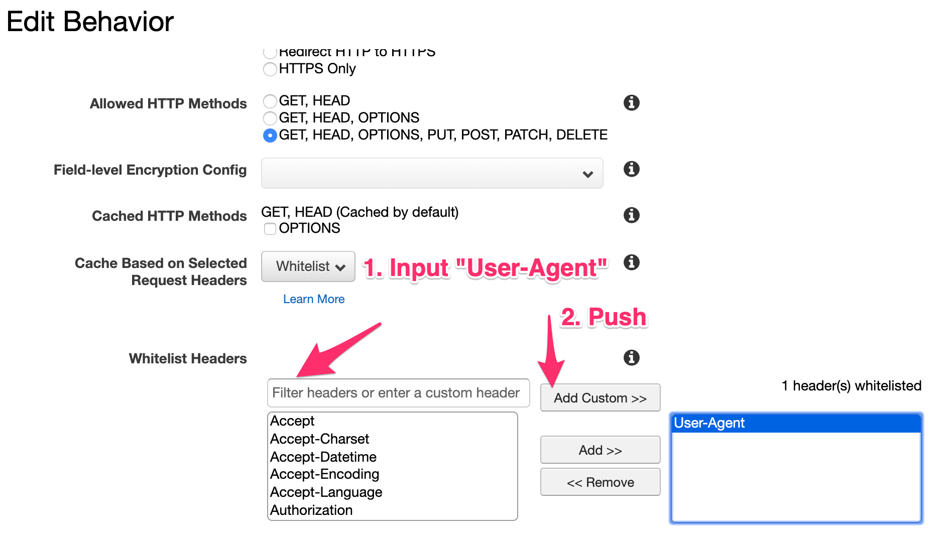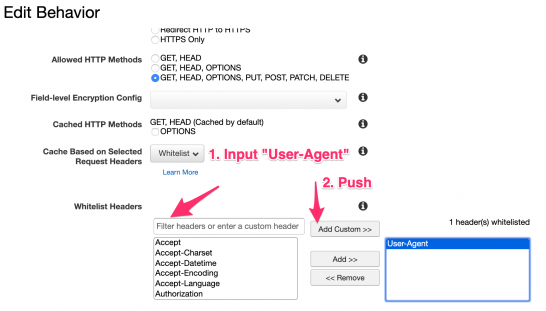 冒頭に貼った他の記事でも紹介されていますが、Whitelist HeadersにUser-Agentを追加する方法が良いかと思います。