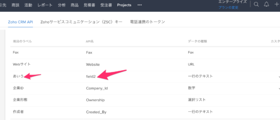 この画像の例だと「あいう」という項目名ですが、API名は「field2」となっていますね。なので、API名を編集して好きな名前をつけると良いかと思います。「Document_Request_Date」とか。field2のまま行く場合で、zoho_hubを利用する場合は
