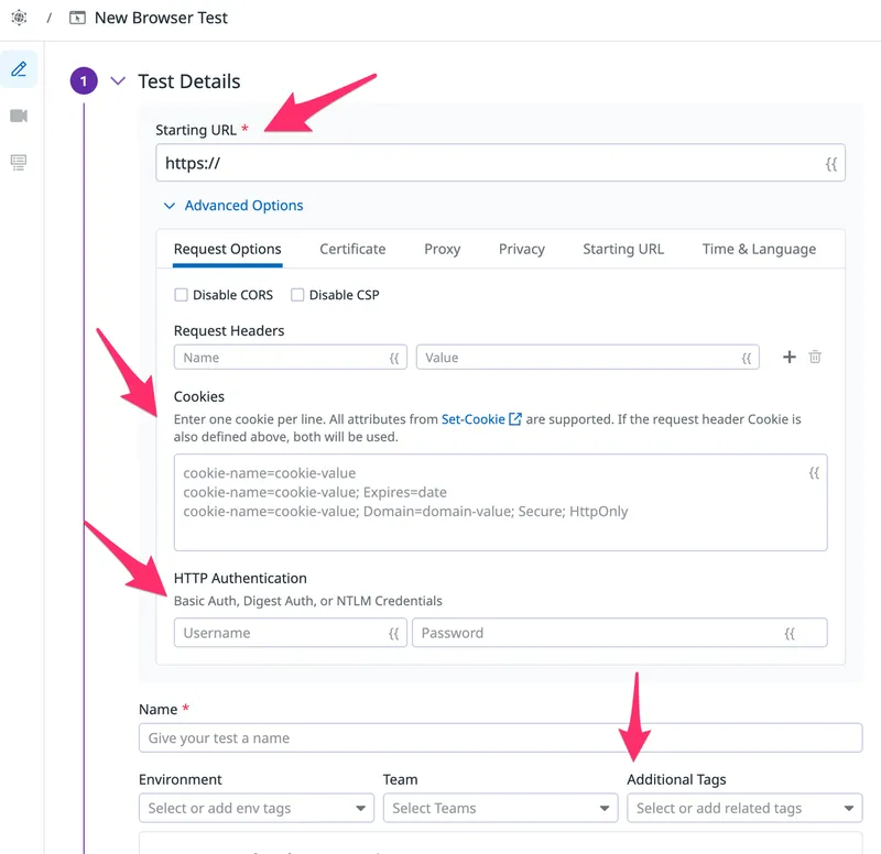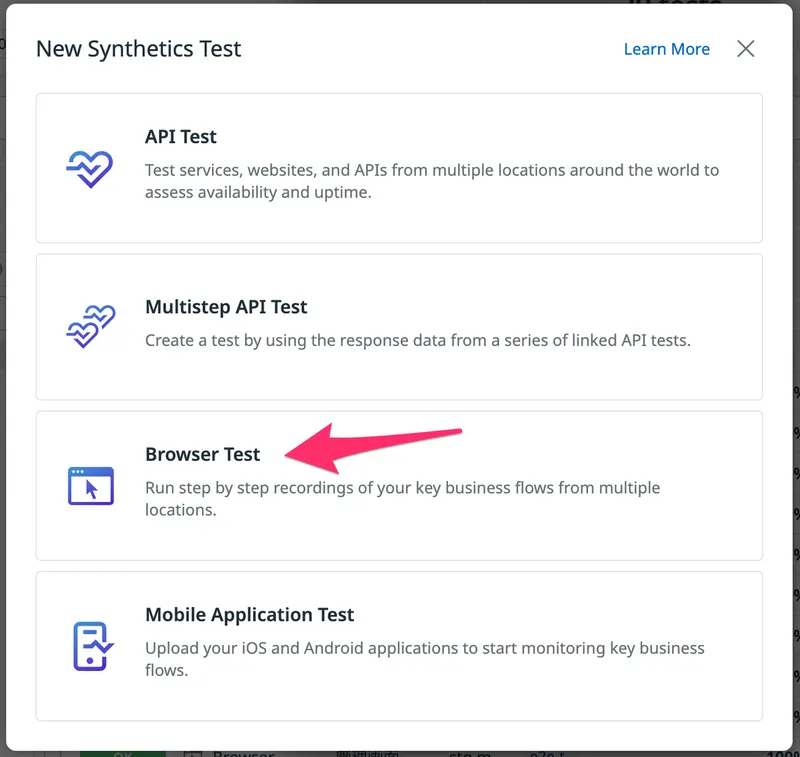 Datadog Synthetic Monitoring & Testingの画面からテストを作成します。