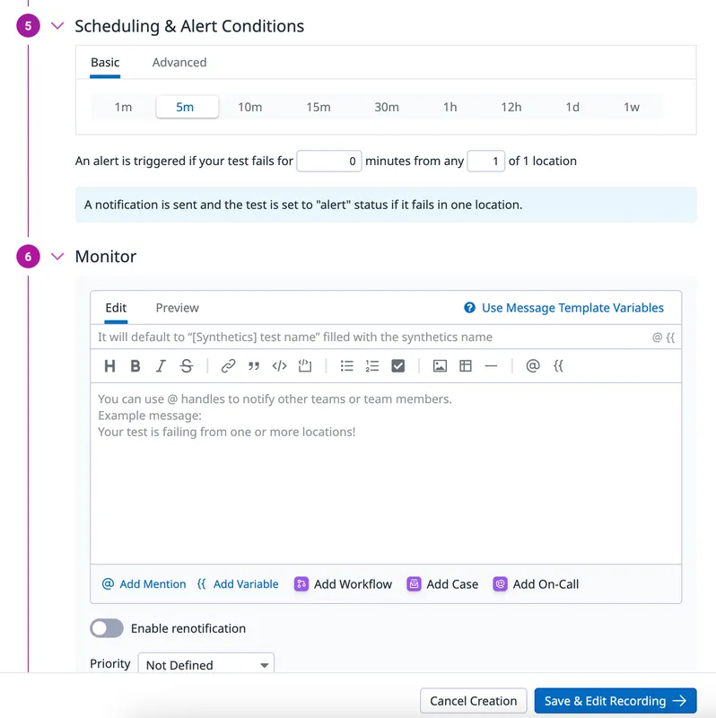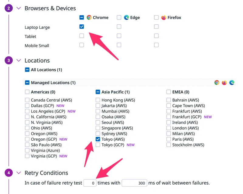 Retry Conditions は重要です。E2Eはどうしても単体テスト等と比較してFlakyになりやすいです。ミツカリでもそのような経験は何度もあります。この問題はRetry Conditionsを設定することで大幅に改善しました。ミツカリでは 1 times に設定しており、失敗した場合でも1回だけ自動でリトライされます。Datadog Synthetic Browser Testはcron的な定期実行もできますが、コマンド実行による即時実行(CIへの組み込み)もできます。その話は後述しますが、定期実行だけでなく、コマンド実行の場合でもこのRetry Conditionsは機能します。