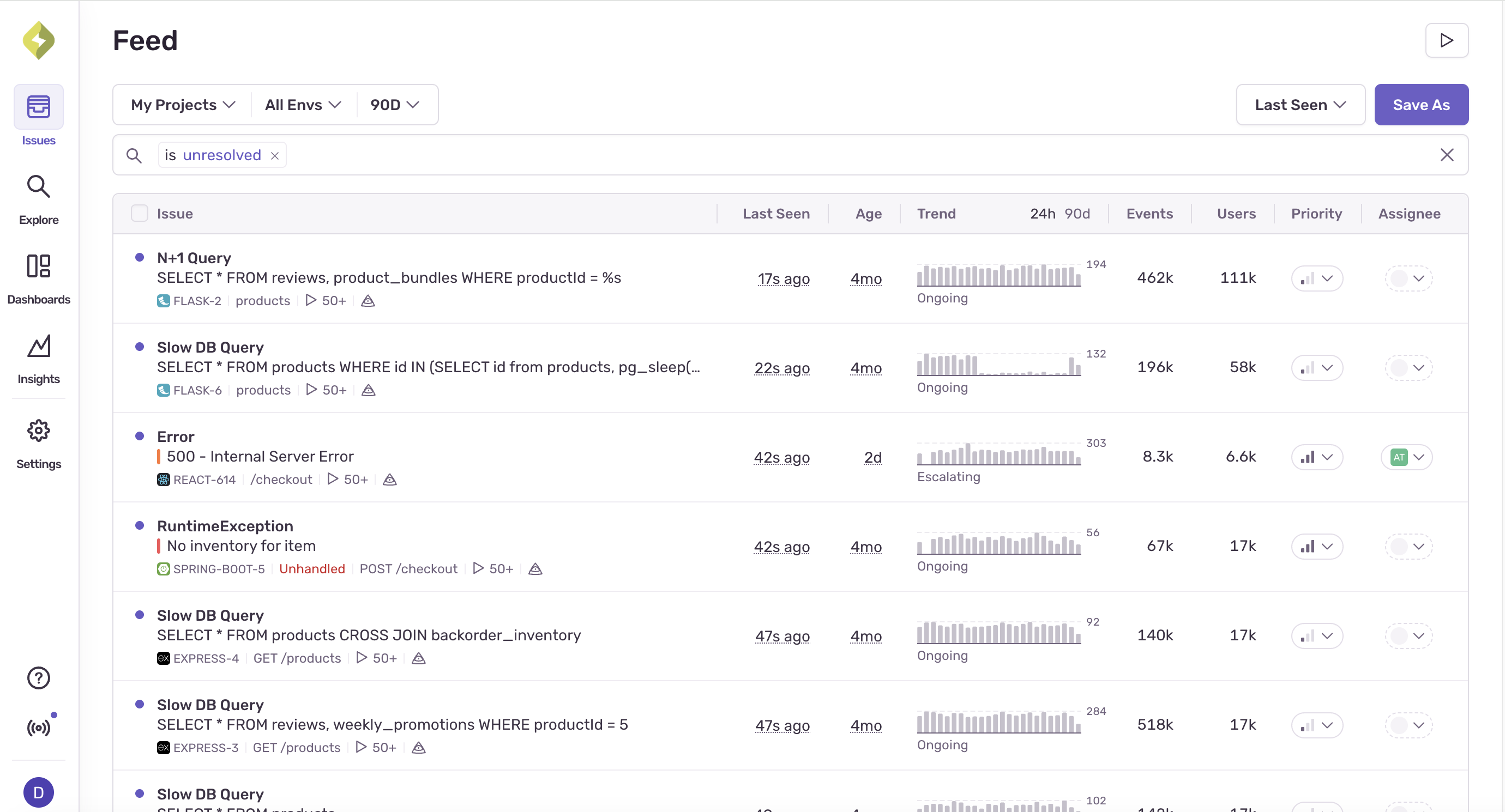 プログラム内で例外が発生するとSentry SDKがそれを捕捉して、Sentryのサーバーに送信してくれます。このエラーはSentry上ではIssueという名称・データで記録されます。