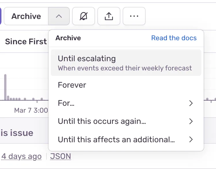 基本的には Until this occurs again... のアーカイブを行うのが良いと思いますが、特にFrontend JSのエラーのときはブラウザ等の環境が非常に多岐にわたるので特定の環境(ユーザー)でしか再現しないようなエラー通知も来たりします。そういう場合は Until this affects an additional... の方が適しているかもしれません。頻度については画面やAPIの特性次第と言えそうですね。