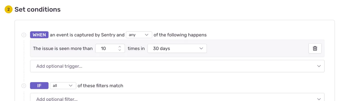 ただし、月に10回しか呼ばれないようなAPIで月に1度エラーが出る場合は10%のエラーになるため、無視はできません。また、Sentryの通知はよく吟味する必要があります。例えばSentryのアラートでは以下のように1ヶ月で10回以上発生した場合のみエラー通知するということもできます。