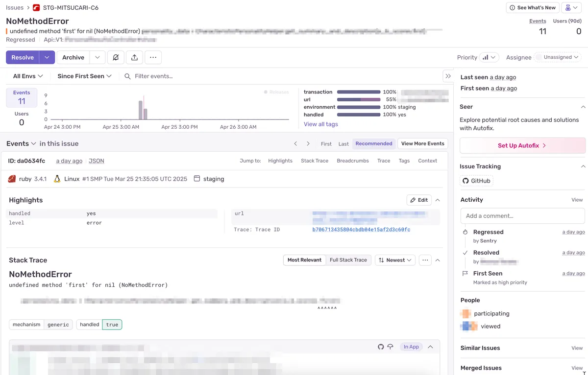 Issueの中にスタックトレースなどの各種情報があるため、それらをヒントにしてどうしてエラーが発生したのか、具体的にどのような問題が発生しているのか特定します。