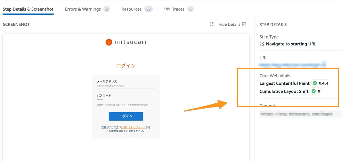 また、Datadogではテスト実行時にパフォーマンスチェックも同時にできます。これはReal User Monitoring(RUM)という製品を併用すると見れるようになります。
