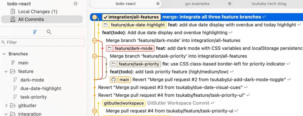 ååã¯GitButlerã®ã¡ãªãããæãã€ã€ãã幟åäžäŸ¿ãã¯æ®ããããªçµæã«ãªããŸããã確ãã«è€æ°ãã©ã³ããgit worktreeãªãã§äžŠåã«æ±ããç¹ã¯è¯ãã§ãããçµå±conflictã¯çºçããŠããŸããŸããä»åã¯æãããŠã©ããªãã®ã§ããããã