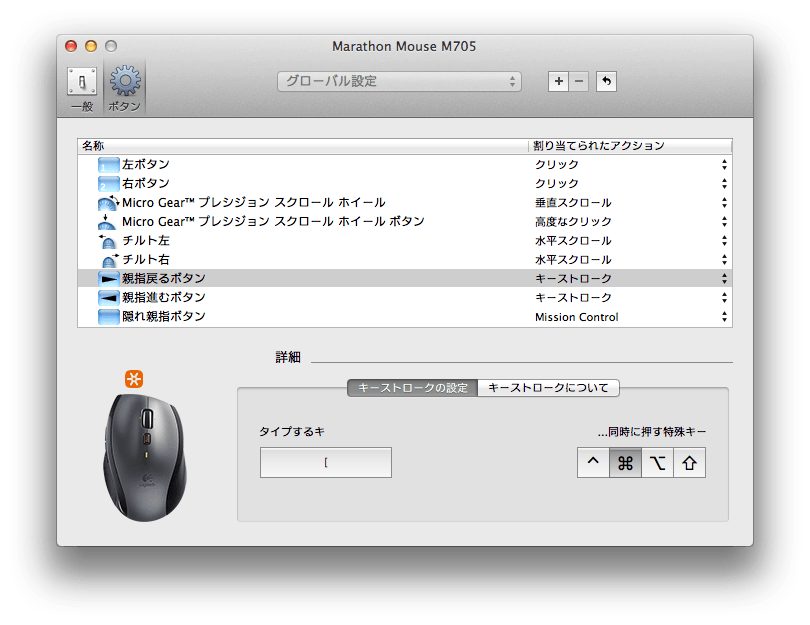 上記のような設定をすると正しく入れ替わってくれます。ただしこれをやると、マウス設定で戻ると進むを設定したのに、そちらが正しく動かなくなってしまいます。マウス設定を変更して、Command + [ではなく、Option + [にすると良いと思います。
