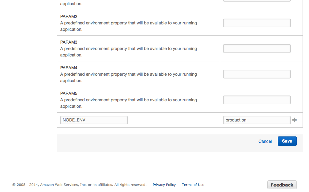 Elastic Beanstalkの管理画面にConfiguration -> Environment Propertiesがあります。ここでは自分で自由に環境変数を設定することができます。