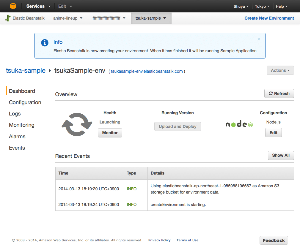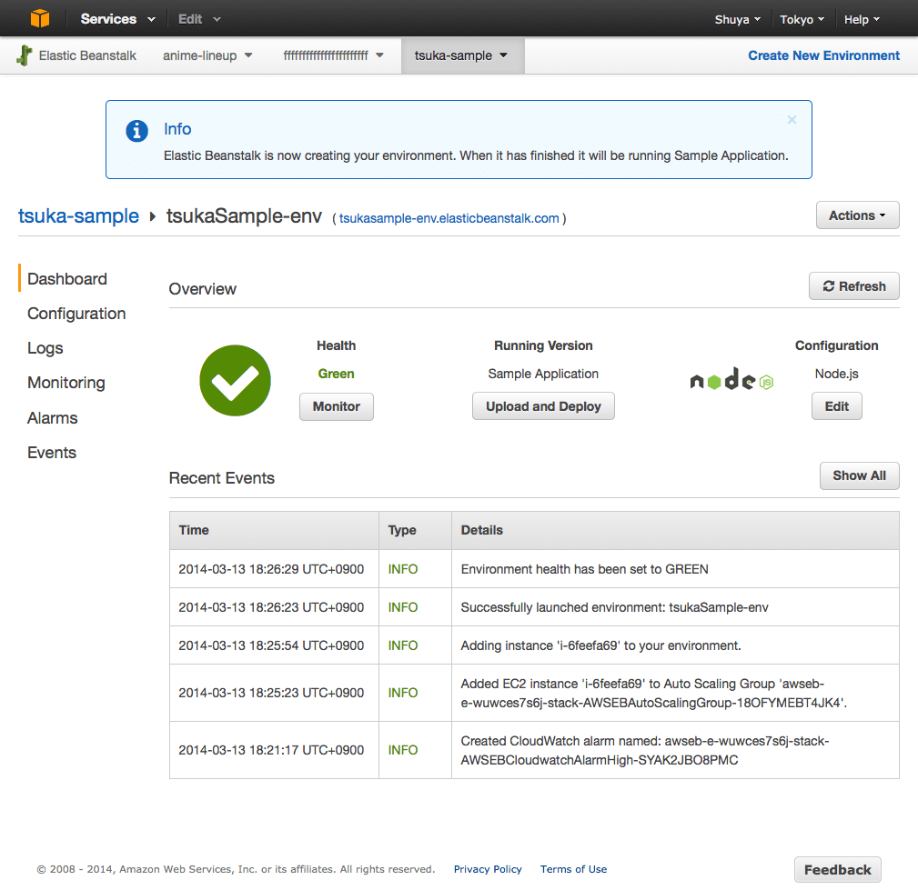 今回eb initのときにいくつか入力を行いました。このとき既にGUIで作成していたアプリ名tsuka-sampleと環境名tsukaSample-envを入力しました。そのため、eb start時にインスタンス等が生成されず、既に存在する環境にデプロイすることができました。もちろん、GUIでアプリや環境を作成していない場合、eb start時に自動で新規作成されます!