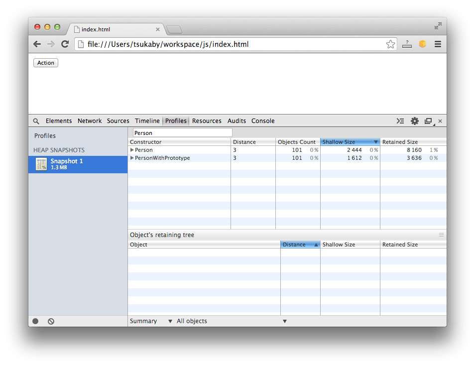 someAction()が実行されたとき、PersonとPersonWithPrototypeが同じ数だけnewされます。