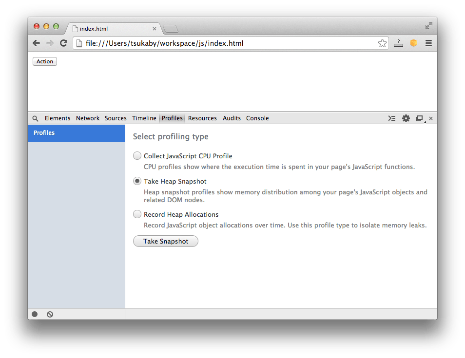 まずはページにアクセスしてボタンを押してオブジェクトを生成します。次に以下の画面のようにProfilesからTake Heap Snapshotを選択して、Take Snapshotボタンを押します。
