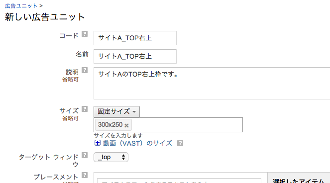 ここではサイトAのTOP画面右上に広告を出す、という想定なので、その広告ユニット1つだけを選択しています。