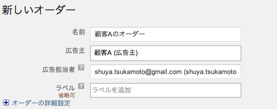 まずは新規オーダーを作成して、以下のような感じで入力します。
