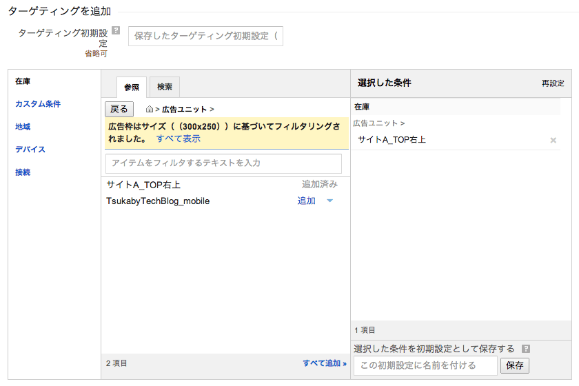 例えばターゲティング。上記の例では広告ユニットを1つだけ選択しましたが、実際には複数選ぶこともできます。また、広告ユニットをまとめてプレースメントとして保存しておくこともできます。