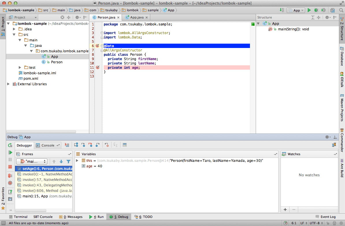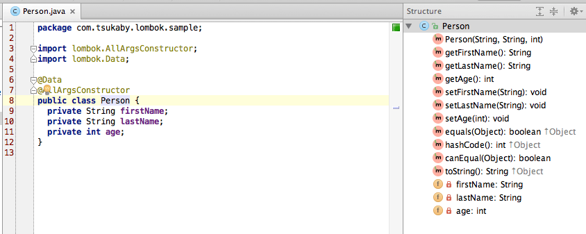例を見てみます。※試す場合はlombokプラグインをインストールしたり(Intellijの場合)、lombokをインストールしたり(Eclipseの場合)してください。