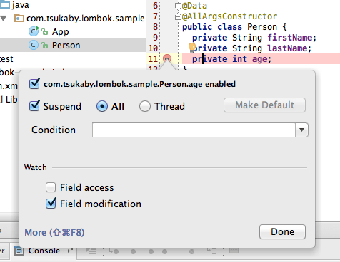 lombokを使う場合の自動生成メソッドのデバッグ(break)
